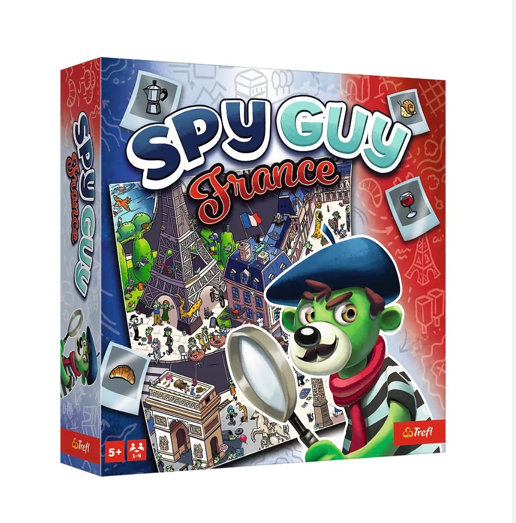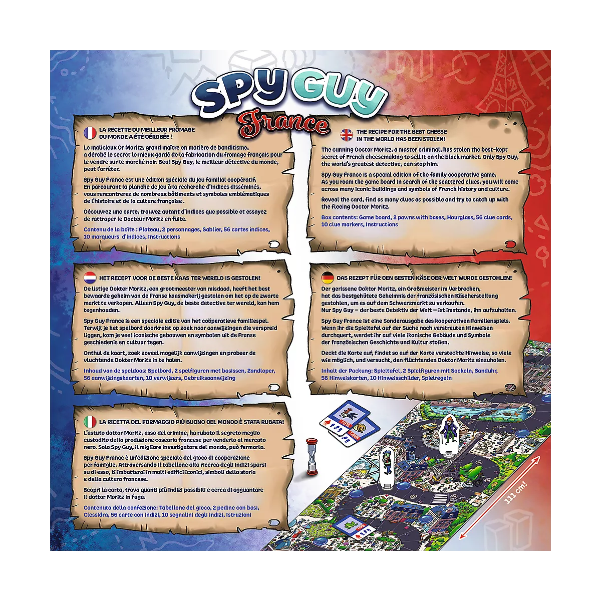 Spy Guy France is een versie van het familievriendelijke, coöperatieve detectivespel, boordevol monumenten en symbolen die verband houden met de Franse geschiedenis en cultuur! De sluwe Dr. Moritz, de Grootmeester van de Misdaad, heeft het geheime recept voor de best bewaarde kaas van Frankrijk gestolen om het op de zwarte markt te verkopen. Alleen Spy Guy, 's werelds beste detective, kan hem stoppen. Het is jouw beurt! Zoek naar aanwijzingen op een enorm speelbord met een diameter van meer dan een meter en probeer de crimineel te vangen voordat hij er met het kostbare recept vandoor gaat!