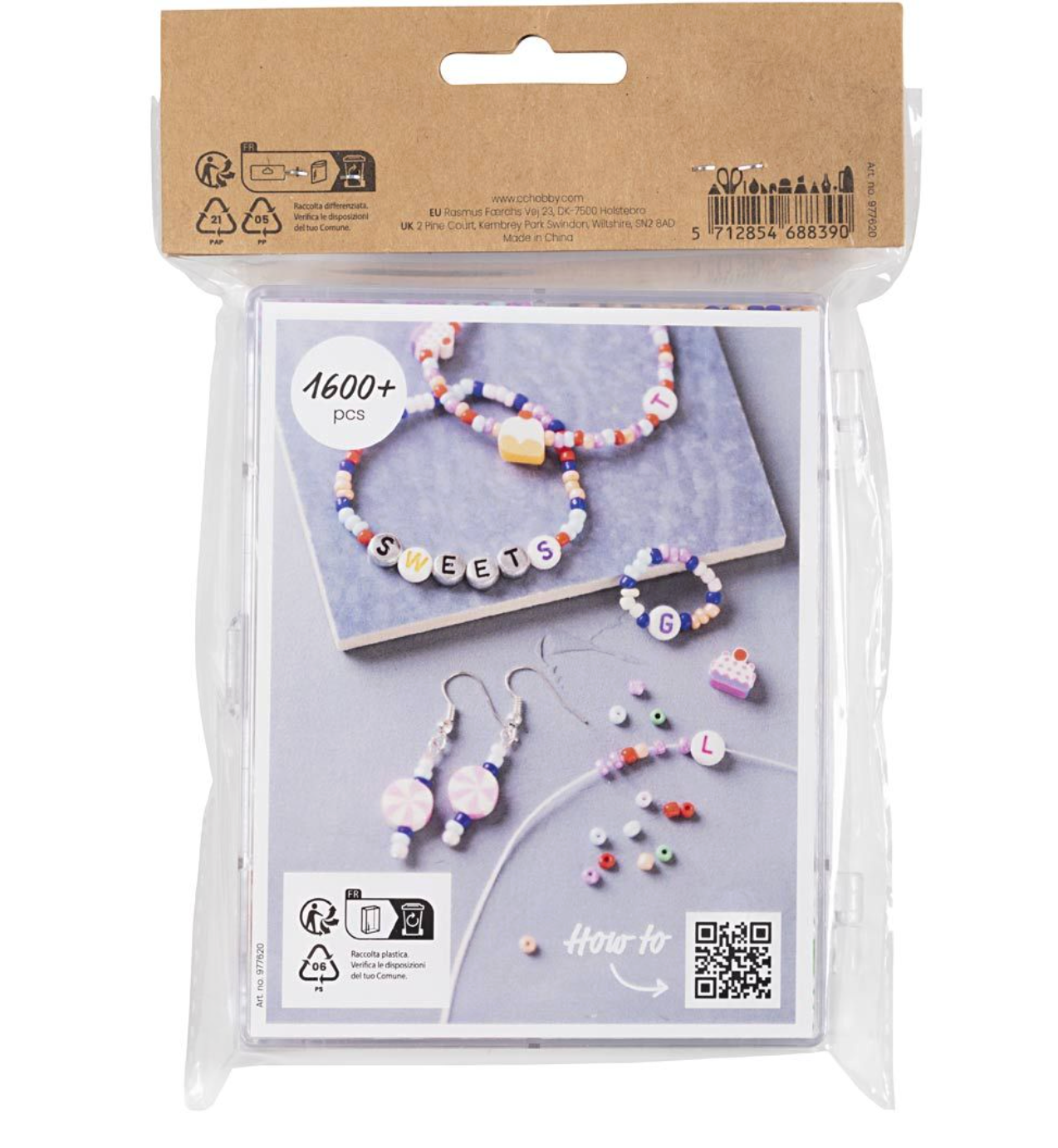 Inhoud: Rocailles, letterkralen, gevormde houten kralen, nietstiften, Franse oorbeldraad en sieradenelastiek.