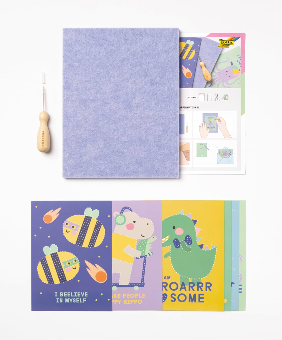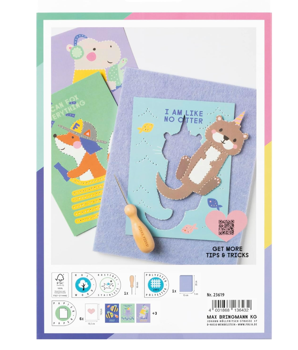 Inhoud: borduurnaald, vilthouder en 6 patroonsjablonen, inclusief instructies en doe-het-zelfideeën