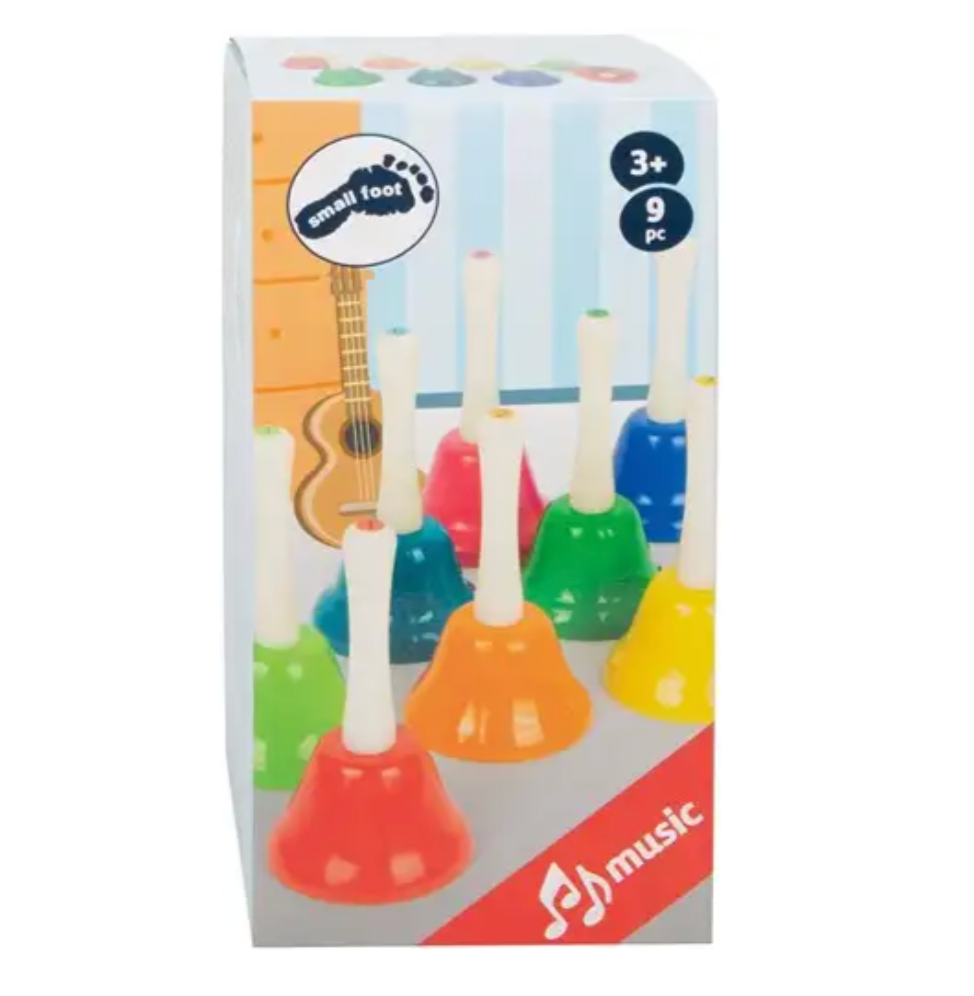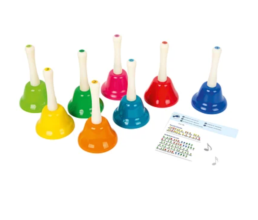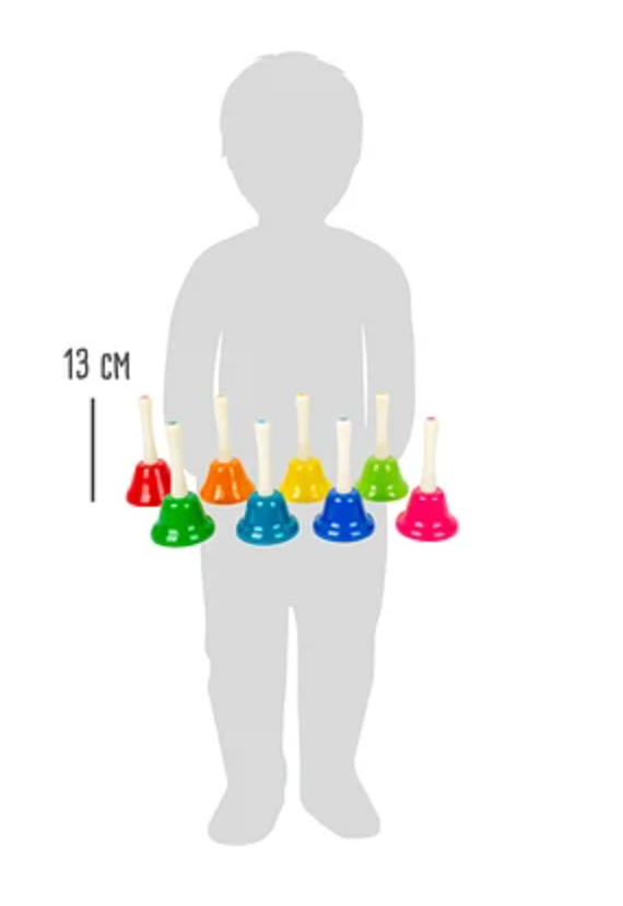 De acht klokken, gecodeerd in kleur en voorzien van notitiestickers, zijn elk afgestemd op de noten C, D, E, F, G, A, H, C. Een muziekblad bij het klokkenspel met acht verschillende liedjes begeleidt kleine muzikanten en is door de presentatie van de noten ook geschikt voor muziekbeginners en kleinere kinderen verschillende kleuren.
