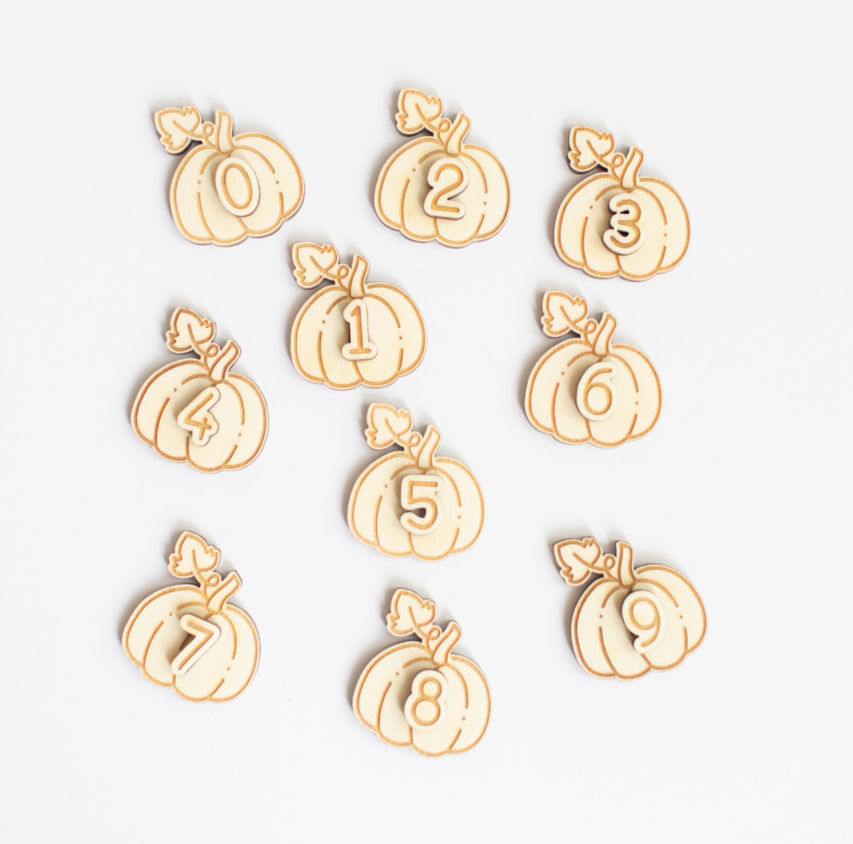 Telfiguren in de vorm van pompoenen met de cijfers 0-9, leuk voor bij bv thema Halloween.
