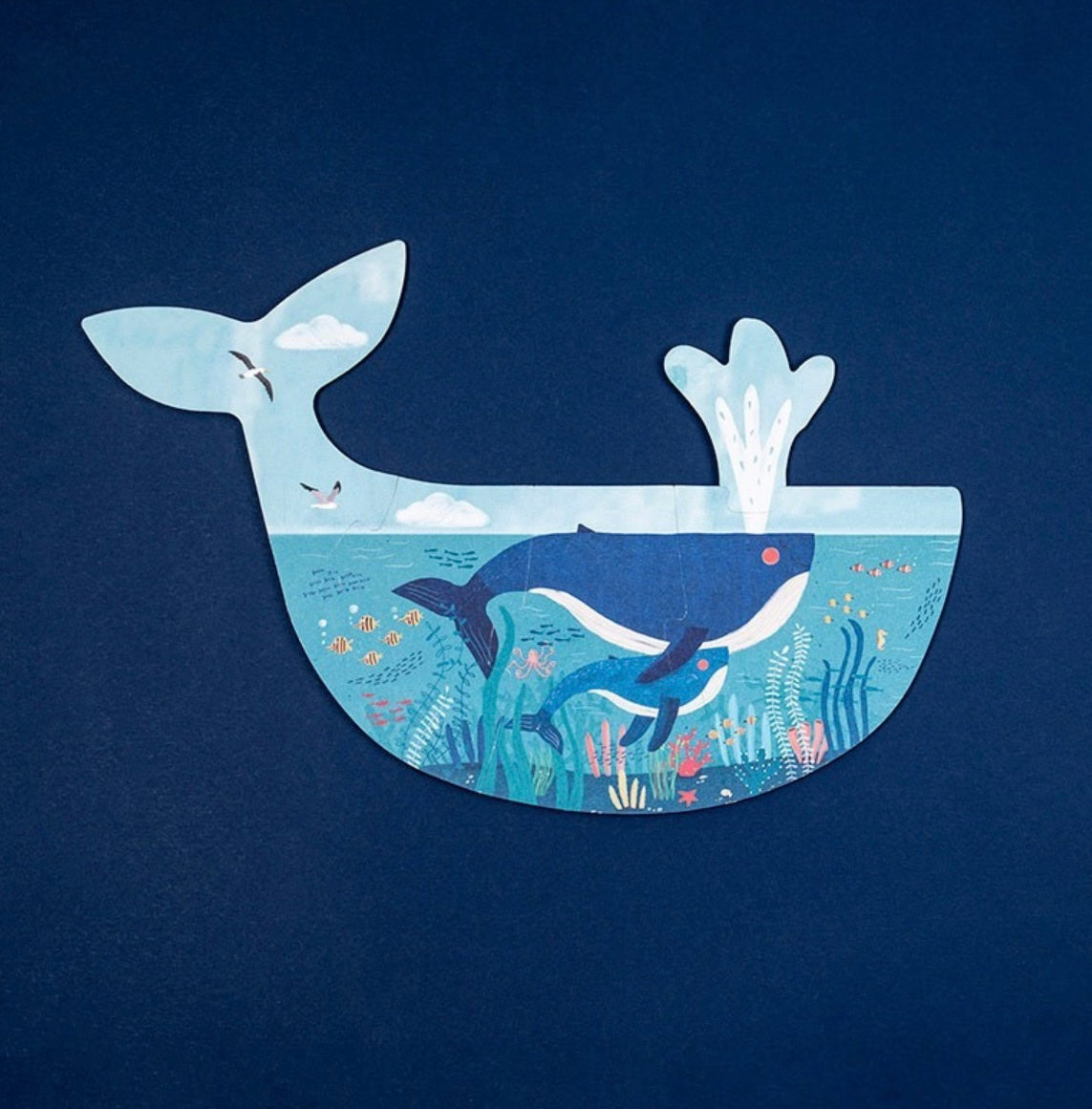 Duik in de diepten van de oceaan! Tussen kalme golven en een kleurrijke onderwaterachtergrond leven magische zeedieren. Met deze set van 7 puzzels bestaande uit verschillende stuks ontdekken kleintjes zeedieren en, op de achterkant van de puzzels, hun baby's, wat het spel een tedere en leuke toets geeft. 7 omkeerbare puzzels met figuren van 2, 3, 4 en 5 stukjes waarmee kleintjes zeedieren kunnen ontdekken. Duurzaam. Ideaal als eerste puzzel.