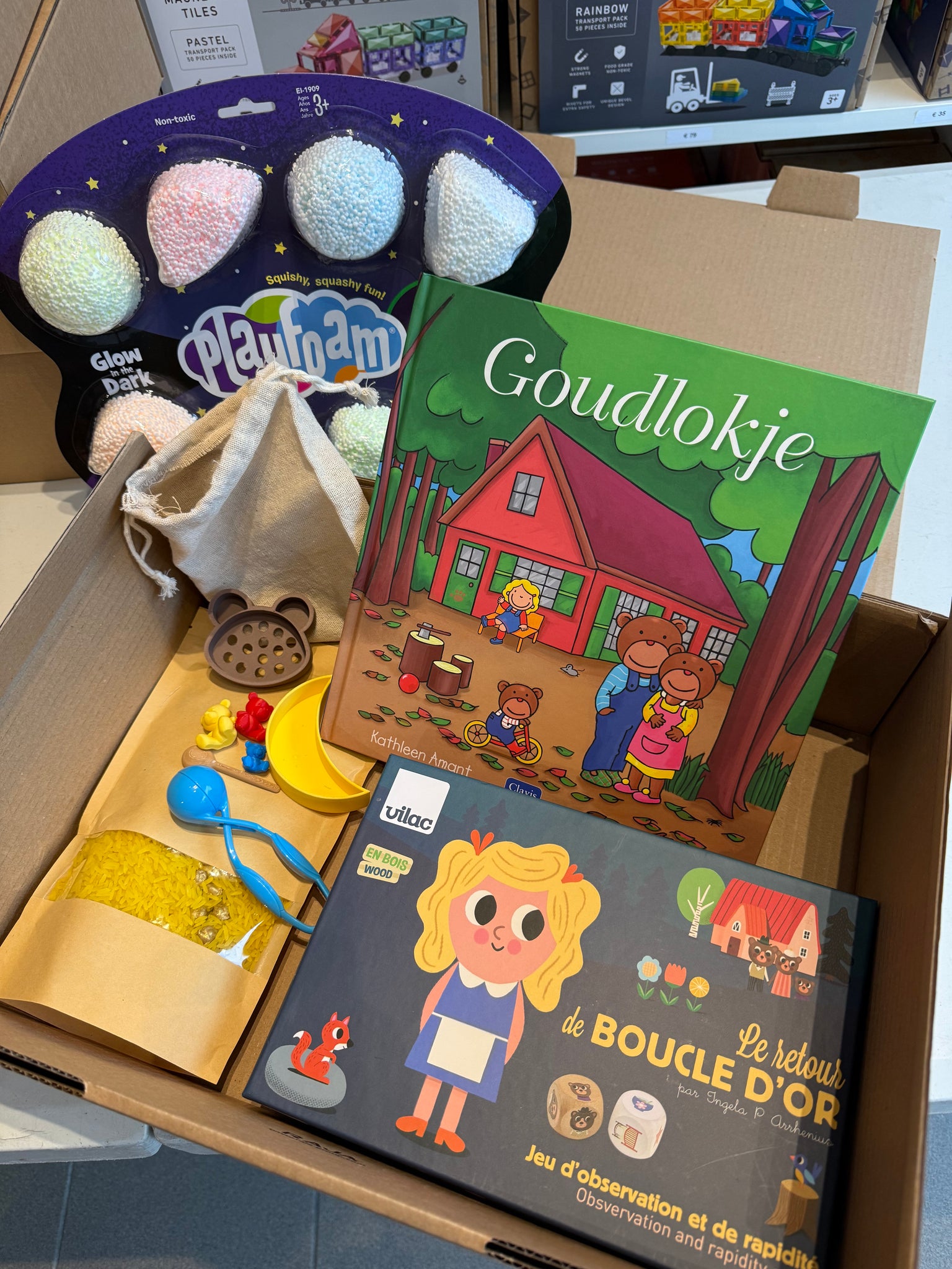 Bij deze box past het verhaal van Goudlokje en de 3 beren van Kathleen Amant. Dit boek zit niet in de box maar kan je hier bij bestellen.