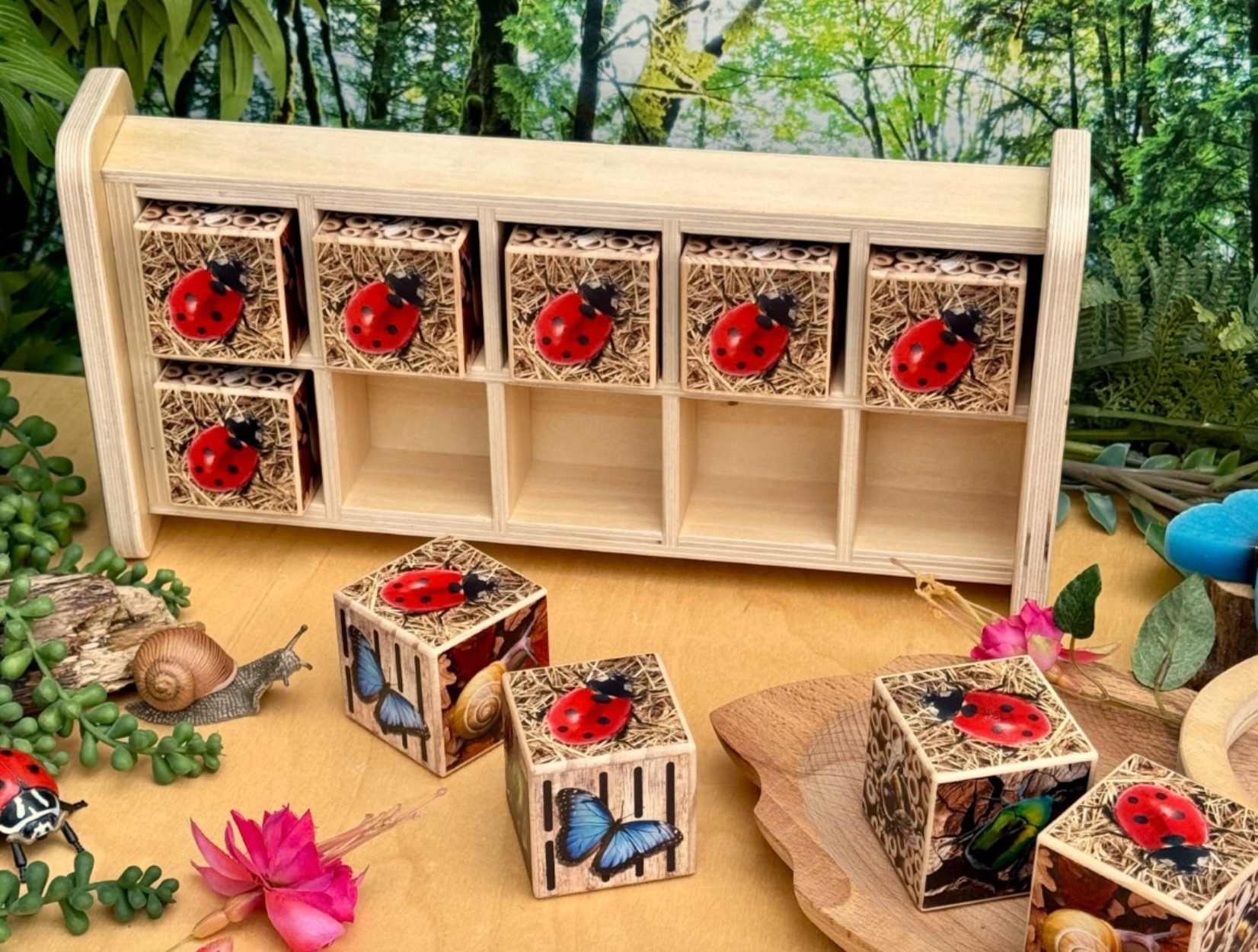 Dit stevige frame is gemaakt van FSC-gecertificeerd hout en bevat tien robuuste grenenhouten kubussen met een bij, kever, vlinder, slak en rode en gele lieveheersbeestjes in hun favoriete leefomgeving.