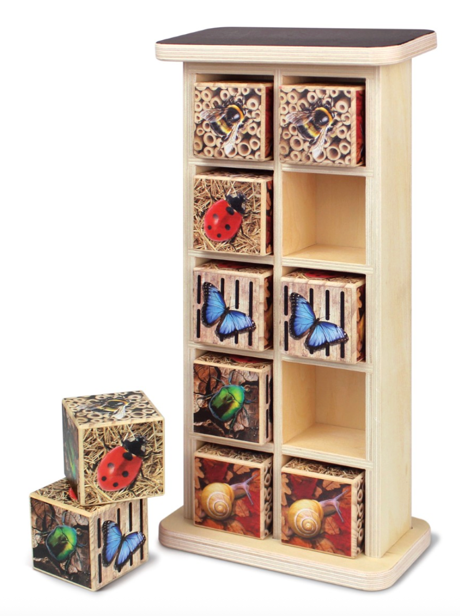 De set bevat één insectenhotel met 10 vakjes en tien massief grenenhouten insectenkubussen.