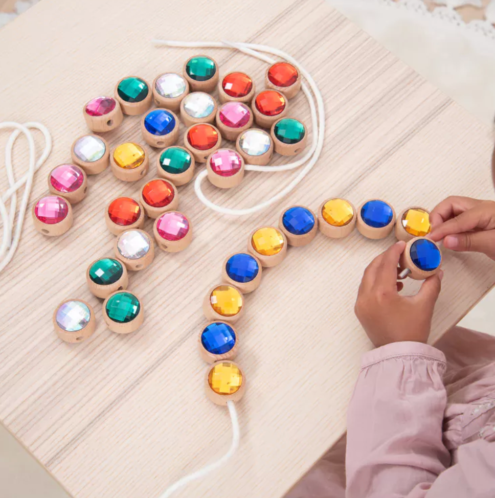 Felgekleurde acryljuwelen omlijst met gladde en grove FSC© beukenhouten omlijstingen. Elk juweel is dubbelzijdig met een gefacetteerde gepolijste afwerking voor een maximale glanzende kleur. Het draadgat door het midden van het hout maakt het mogelijk om de juwelen in een geordende of willekeurige volgorde aan elkaar te rijgen.