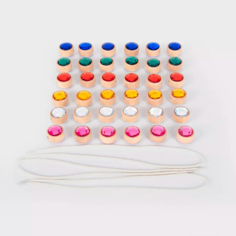 De set bevat 36 juwelen in rood, goud, groen, blauw, roze en zilver (6 van elke kleur), 3 veters en een katoenen opbergtas met trekkoord.