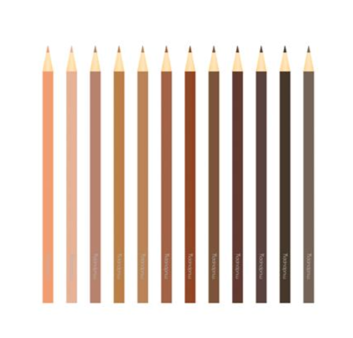 Deze kleurpotlodenset bevat 12 huidkleurige kleurpotloden, niet alleen in perzik en bruin, waardoor alle kinderen zich vertegenwoordigd voelen.