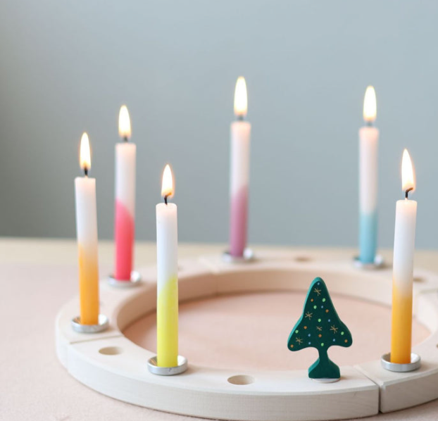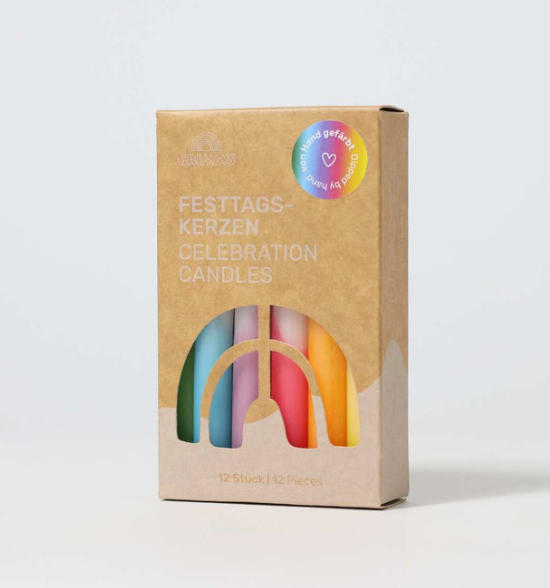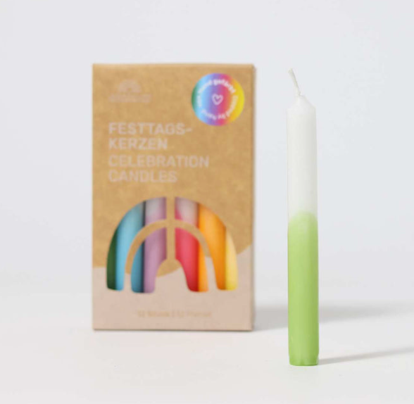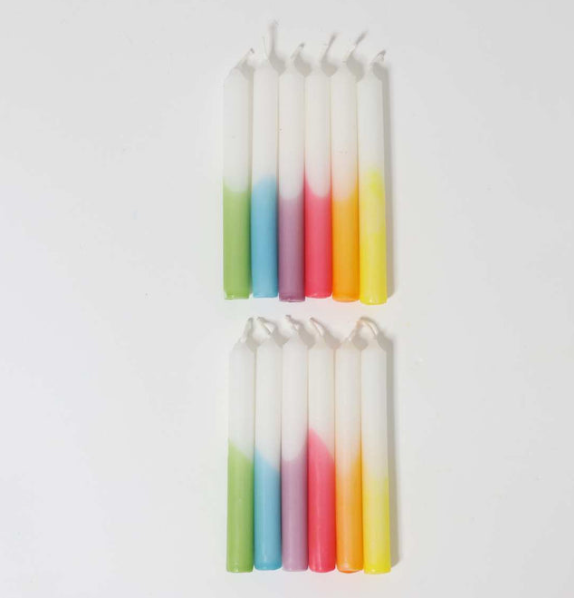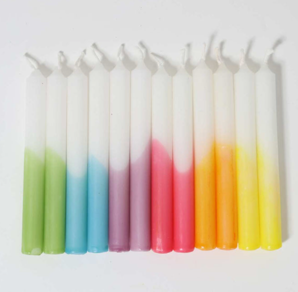 12 handgedoopte feestkaarsen in regenboogkleuren. Ze passen perfect in onze feestringen, feestspiralen en levenslichten. Ze passen goed bij de kaarsenhouders van messing of aluminium. 12 kaarsen.