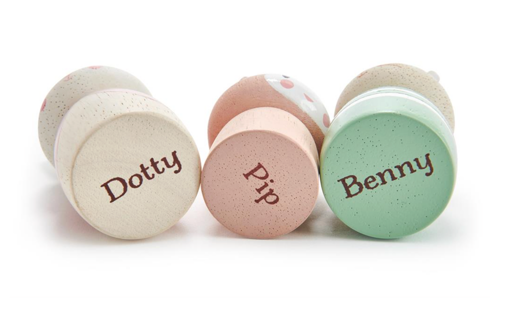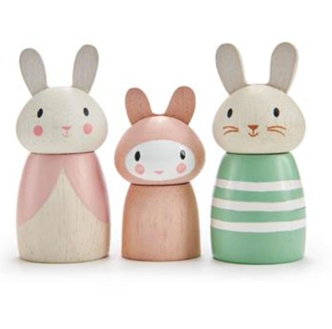 Deze houten konijnen familie is gemaakt van duurzaam geteeld hout. Hij helpt je kind met het stimuleren van zijn fantasiespel! Dotty de moeder, Benny de vader en Pip de baby, allemaal afgewerkt in stijlvolle kleuren en klaar om toe te voegen aan een poppenhuisset of open speelset.