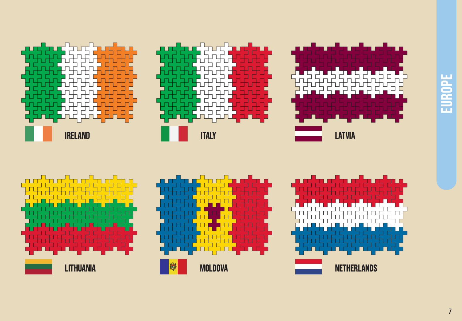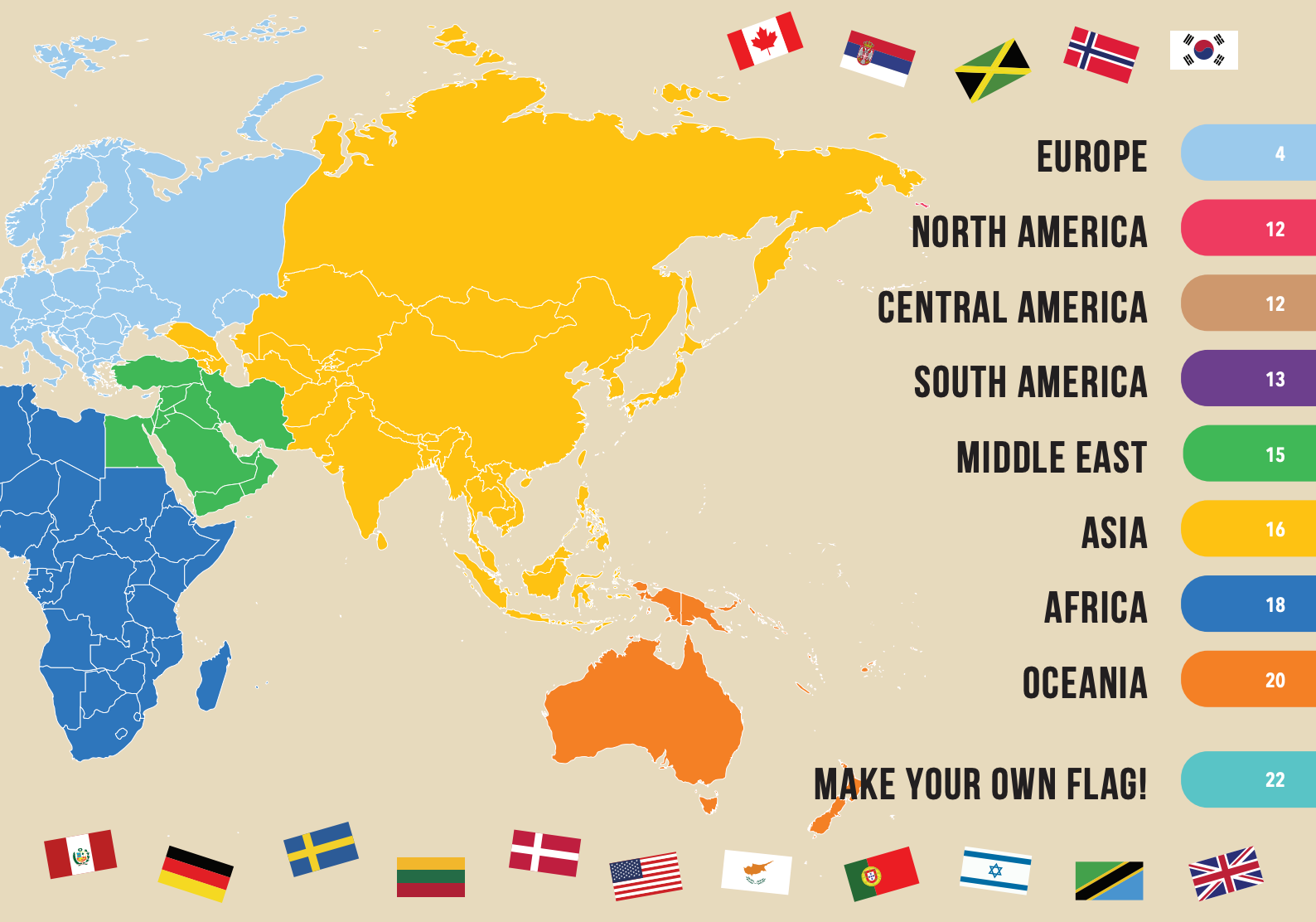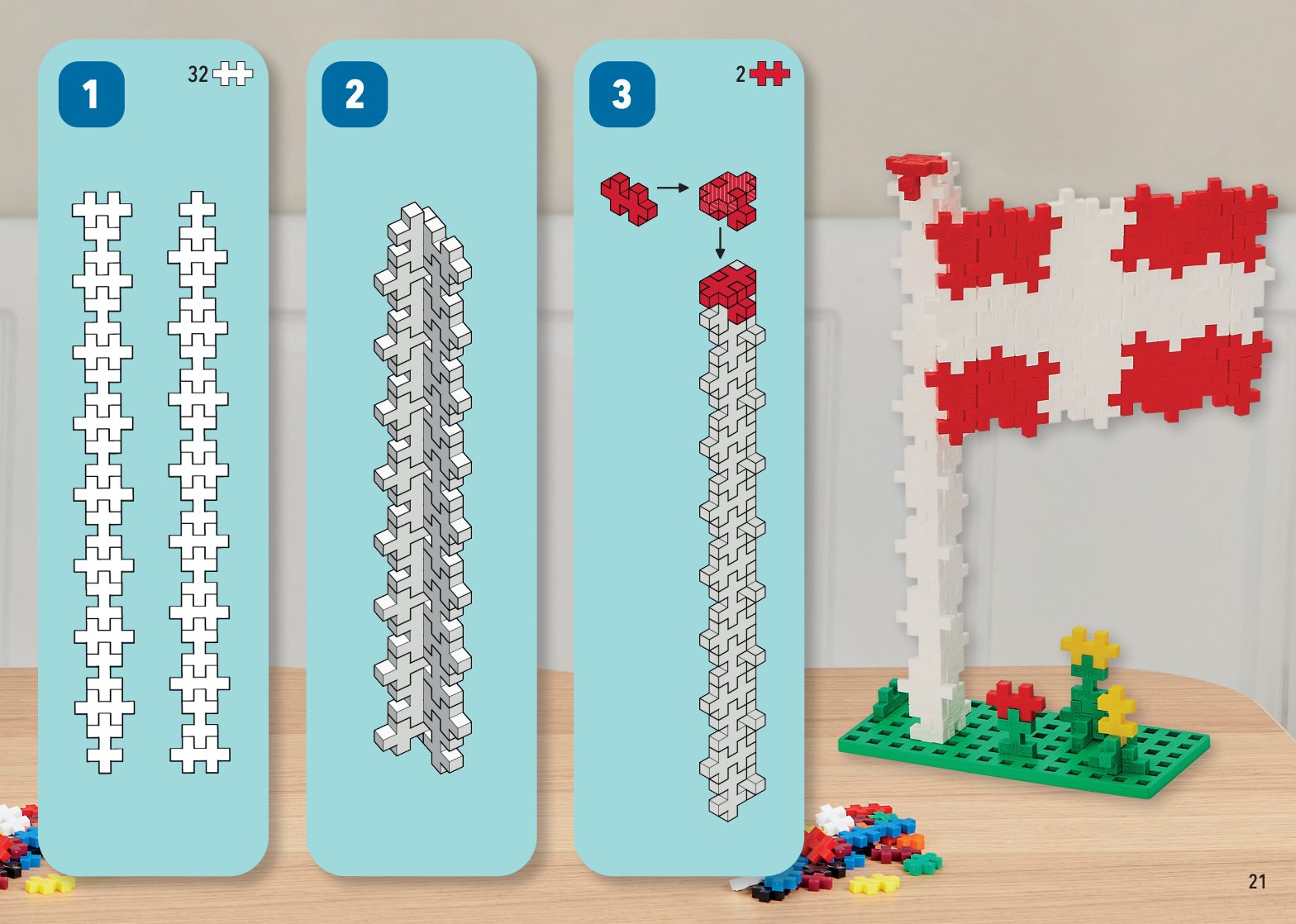 Leer iconische vlaggen bouwen, zoals de Deense, Amerikaanse, Japanse en vele andere. Wees creatief en maak je eigen versies van de vlaggen of combineer ze op fantasierijke manieren.
