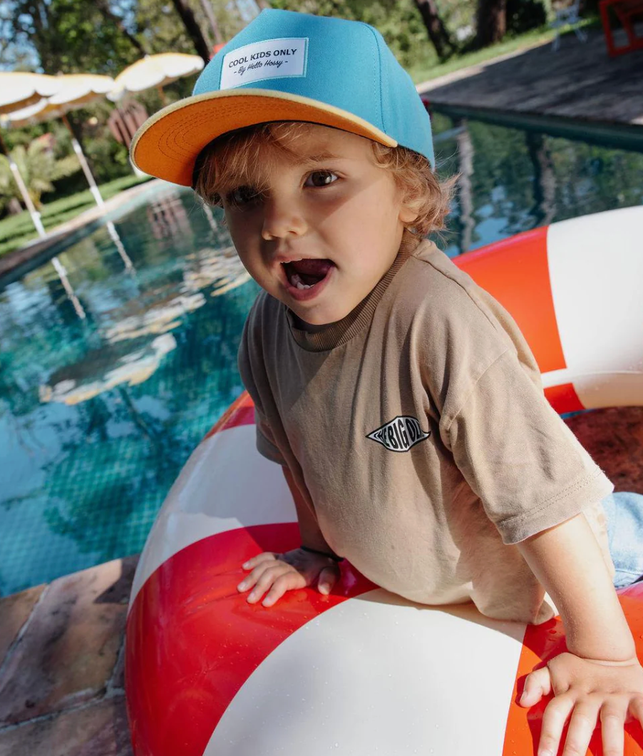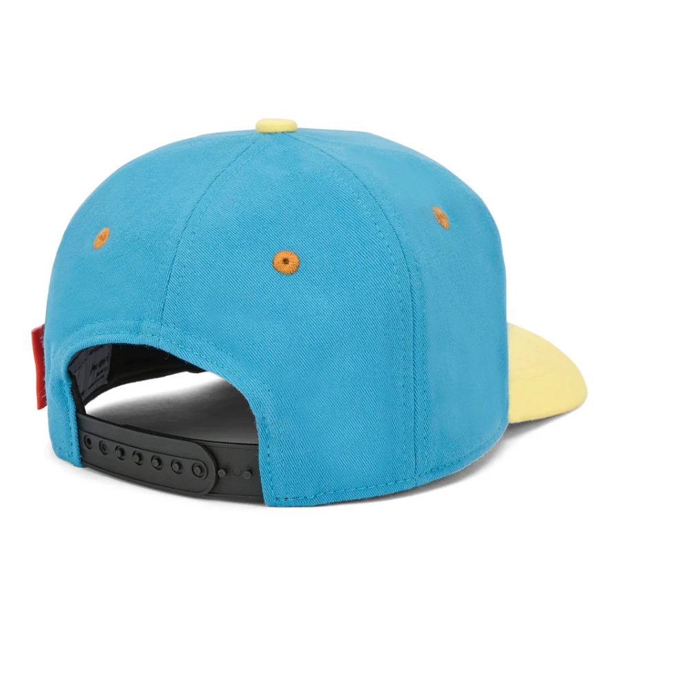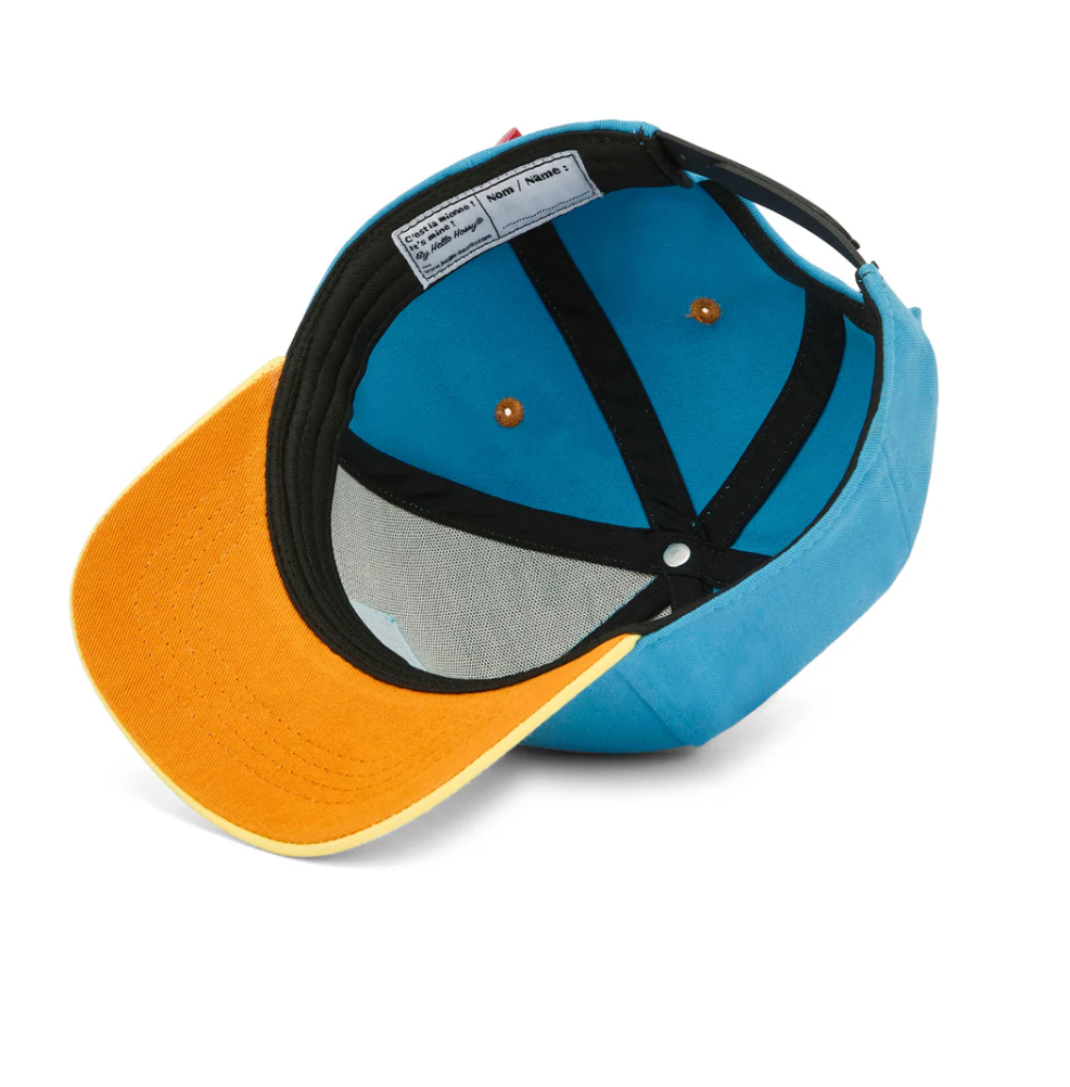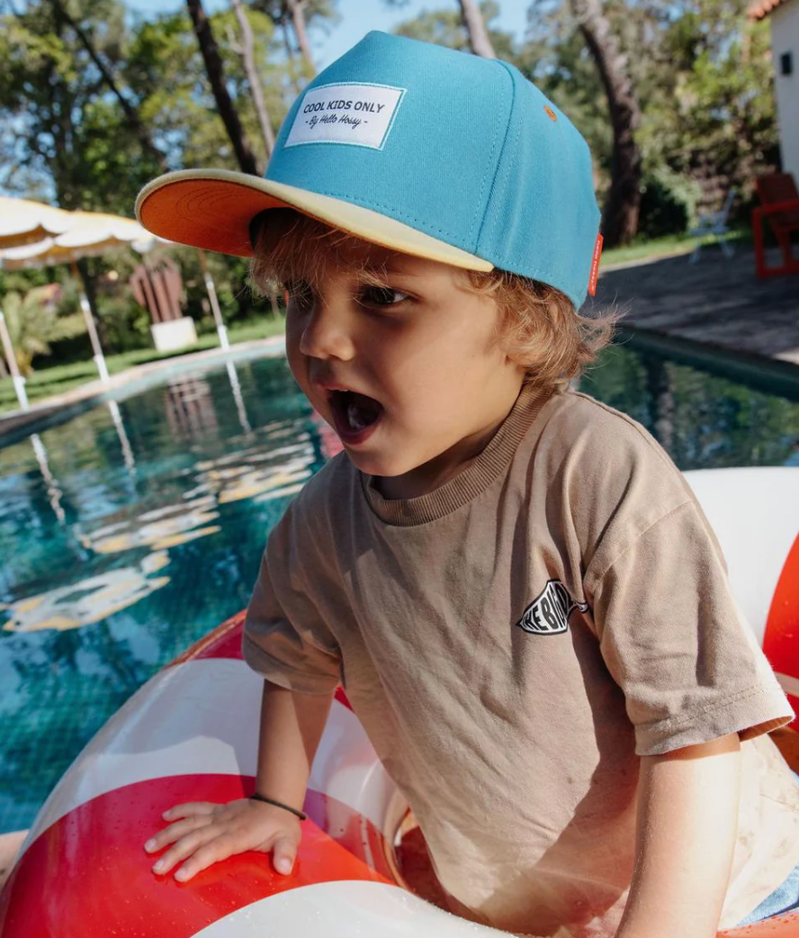 Ontdek de Mini Sunny Blue pet voor kinderen. Gemaakt van biologisch katoen, milieuvriendelijk en met een mix van blauw en geel, is het de perfecte pet voor de zomer. Verkrijgbaar in 2 kindermaten.