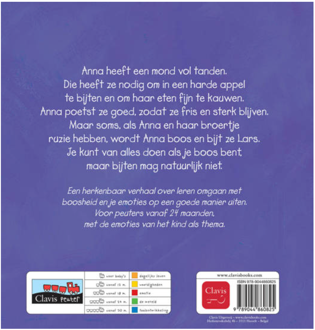 Anna heeft een mond vol tanden. Die heeft ze nodig om in een harde appel te bijten en om haar eten fijn te kauwen. Anna poetst ze goed, zodat ze fris en sterk blijven. Maar soms, als Anna en haar broertje ruzie hebben, wordt Anna boos en bijt ze Lars. Je kunt van alles doen als je boos bent, maar bijten mag natuurlijk niet.