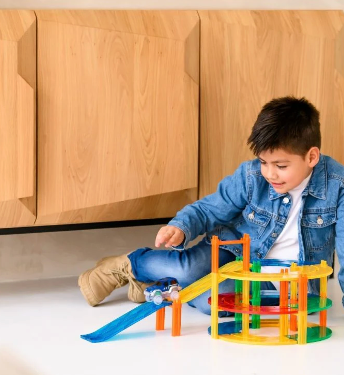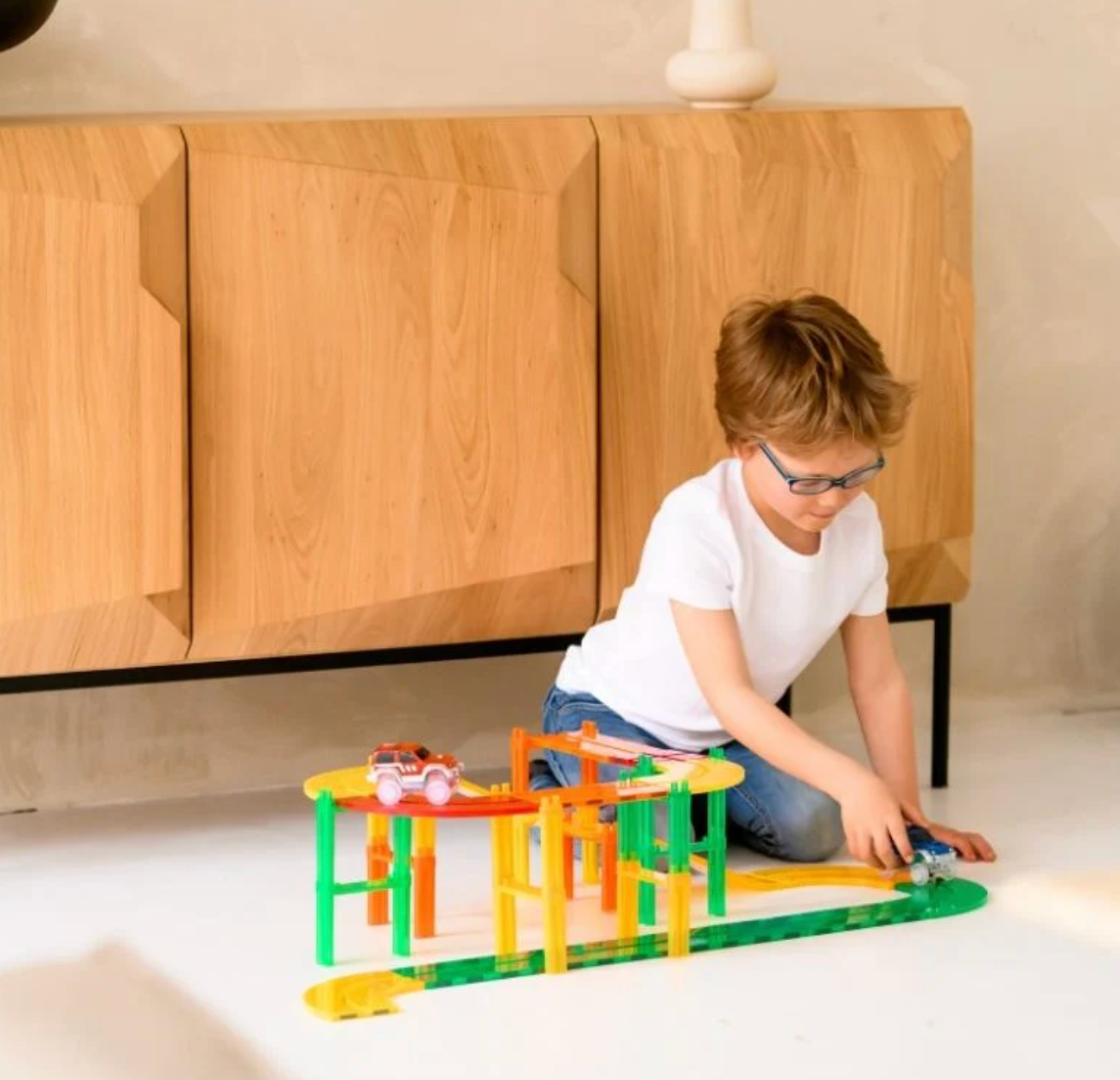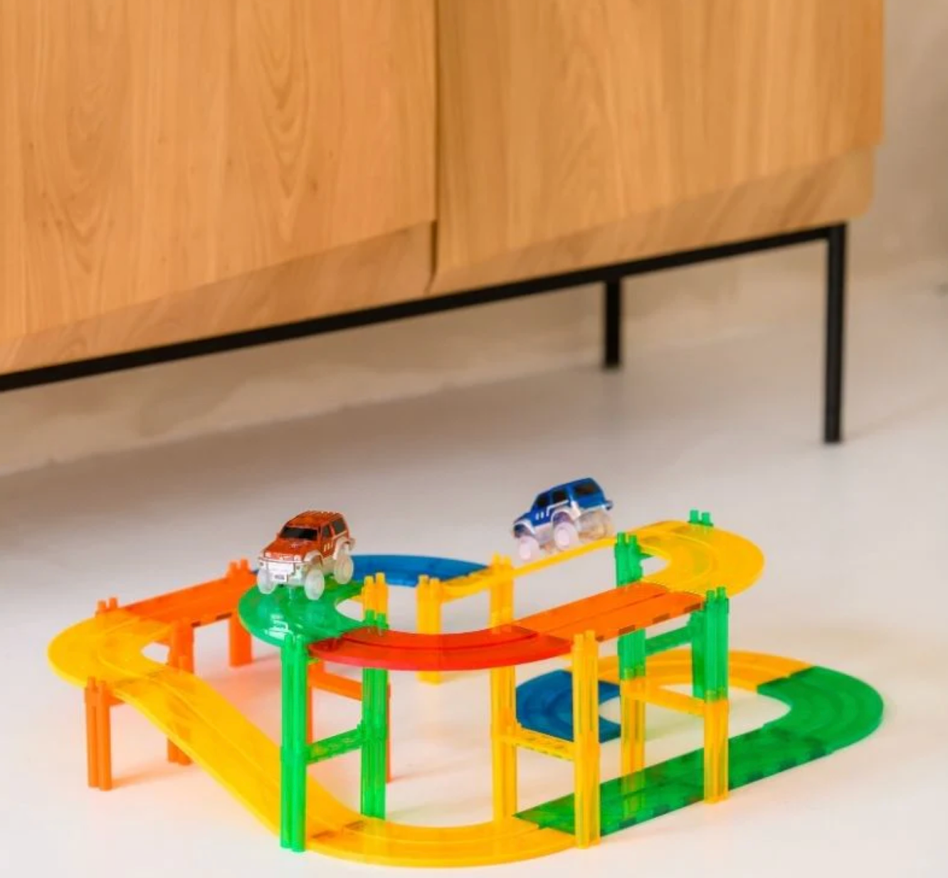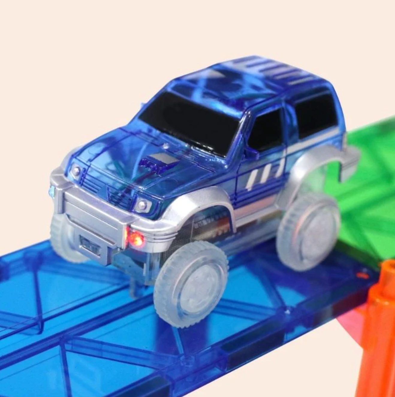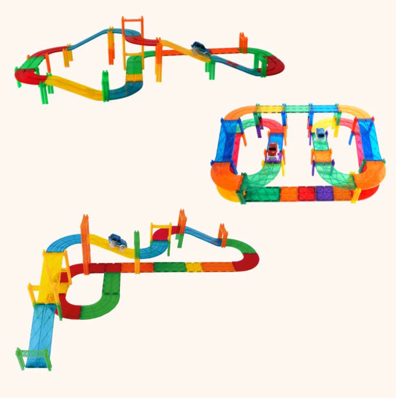 De bouwblokken bevatten magneetjes, waardoor kinderen deze makkelijk zelf aan elkaar klikken en de autootjes rijden (op batterij) zelfstandig over de baan. De racebaan is ook leuk te combineren met de andere magneetsets, waarmee kinderen bijvoorbeeld een dorp of viaduct over de racebaan kunnen bouwen. Compatibel met andere merken zoals Connetix of MagnaTiles.