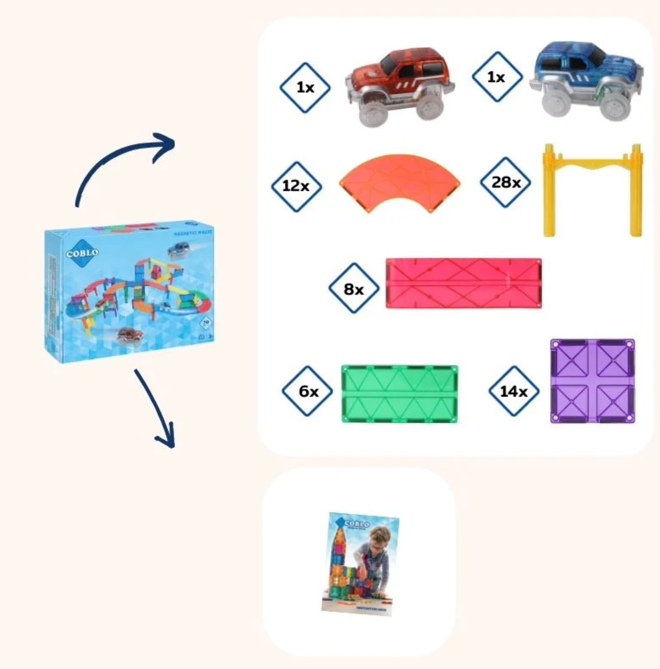 Bouw je eigen toffe stoere racebaan met auto's die zelf rijden. Dat willen toch alle kinderen! En dan ook nog iedere keer een andere variant. De kleurrijke magnetische onderdelen prikkelen de creativiteit en fantasie van kinderen wat zorgt voor geweldige racebanen. Zo creëren kinderen al vanaf jonge leeftijd hun eigen parcours. De Coblo racebaan zorgt voor eindeloos bouwplezier en vooral leuke spanning hoe snel de raceauto’s de eindstreep halen. Door een gleuf in de tegels blijven de auto's mooi op de baan.