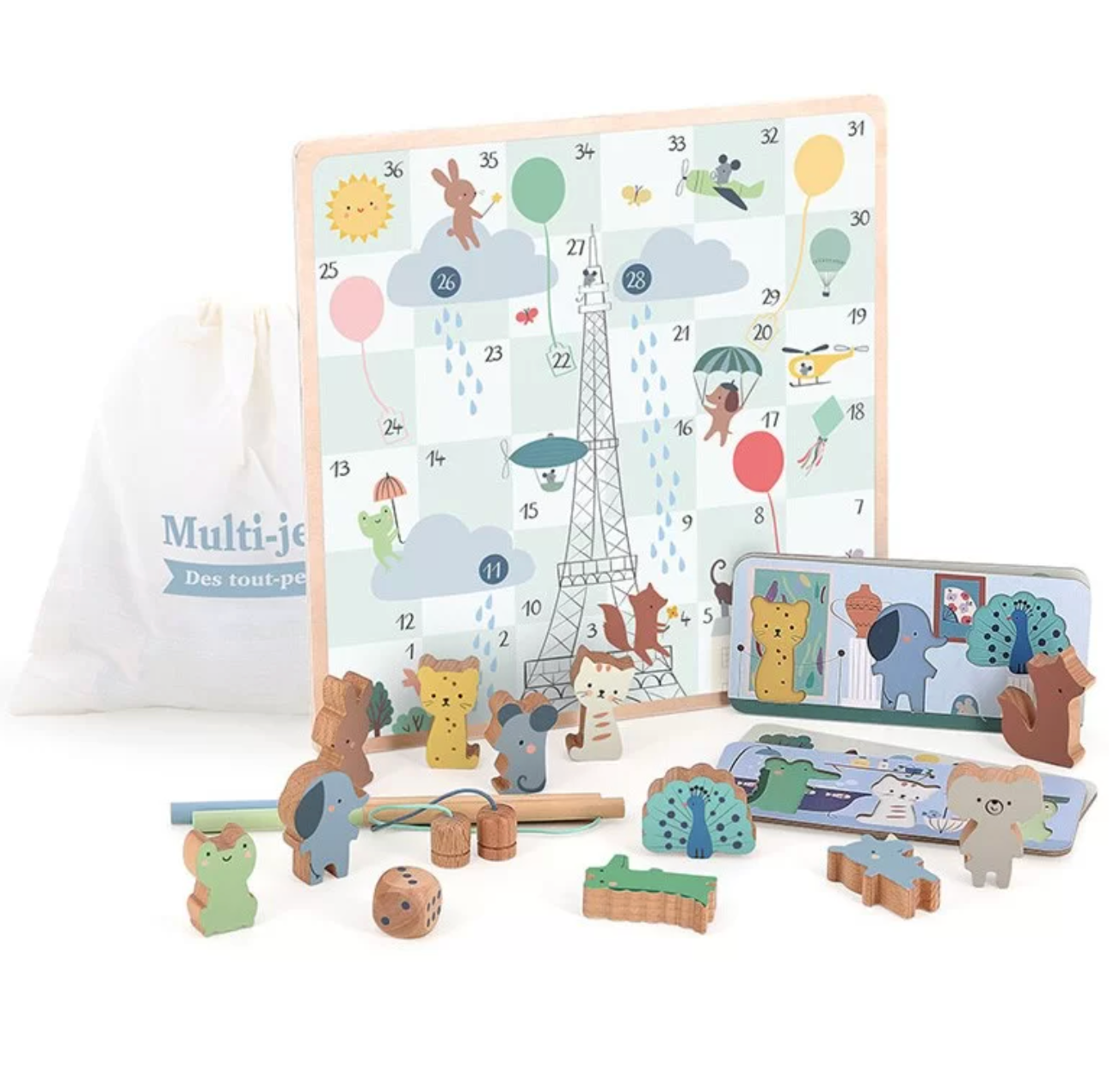De houten figuren kunnen in alle vier de spellen gebruikt worden: Ganzenbord, ladderspel, vissen en lotto. Elk spel wordt een leuk avontuur, perfect voor de ontwikkeling van motoriek, logica en vooral het delen van bijzondere momenten met het gezin. Welke kies jij?