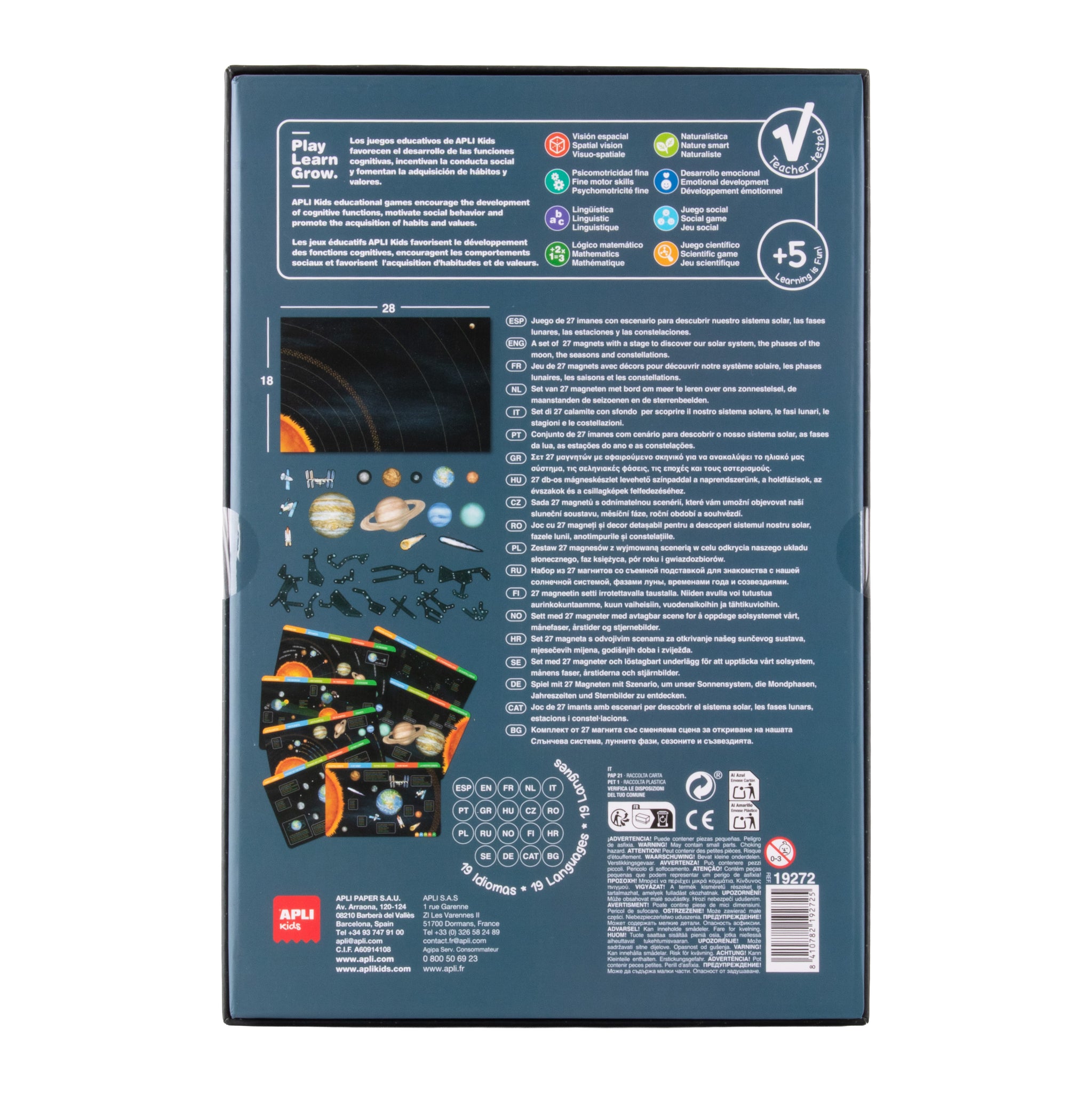 Elke set bevat: 1 magnetisch speelbord van 28 x 18 cm dat in de bodem van de doos past, 27 magneten en 7 kaarten met gedetailleerde informatie in 10 verschillende talen.