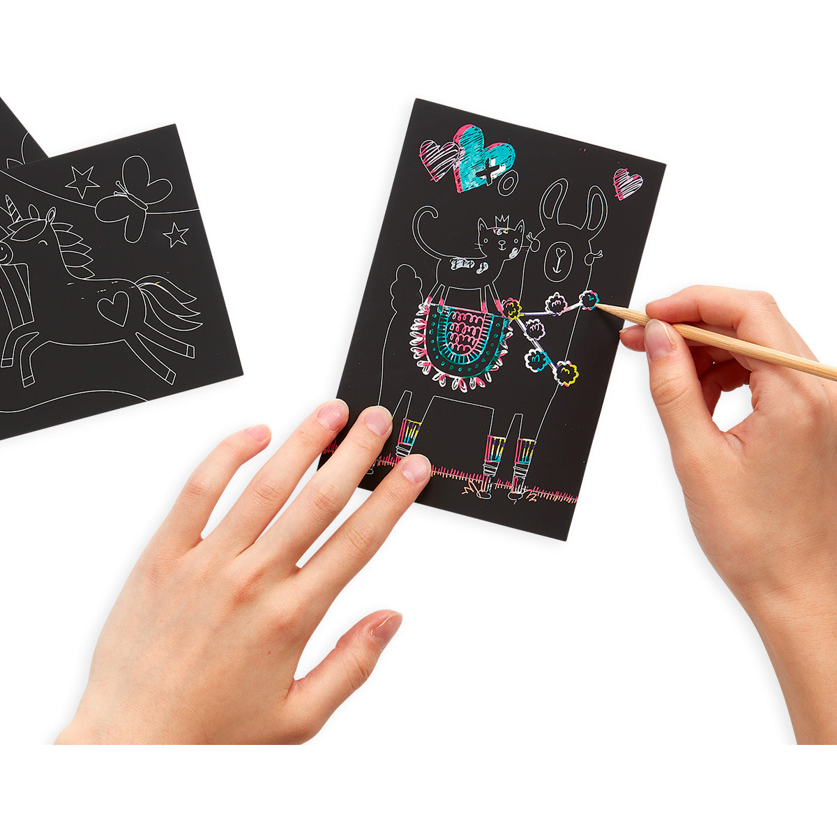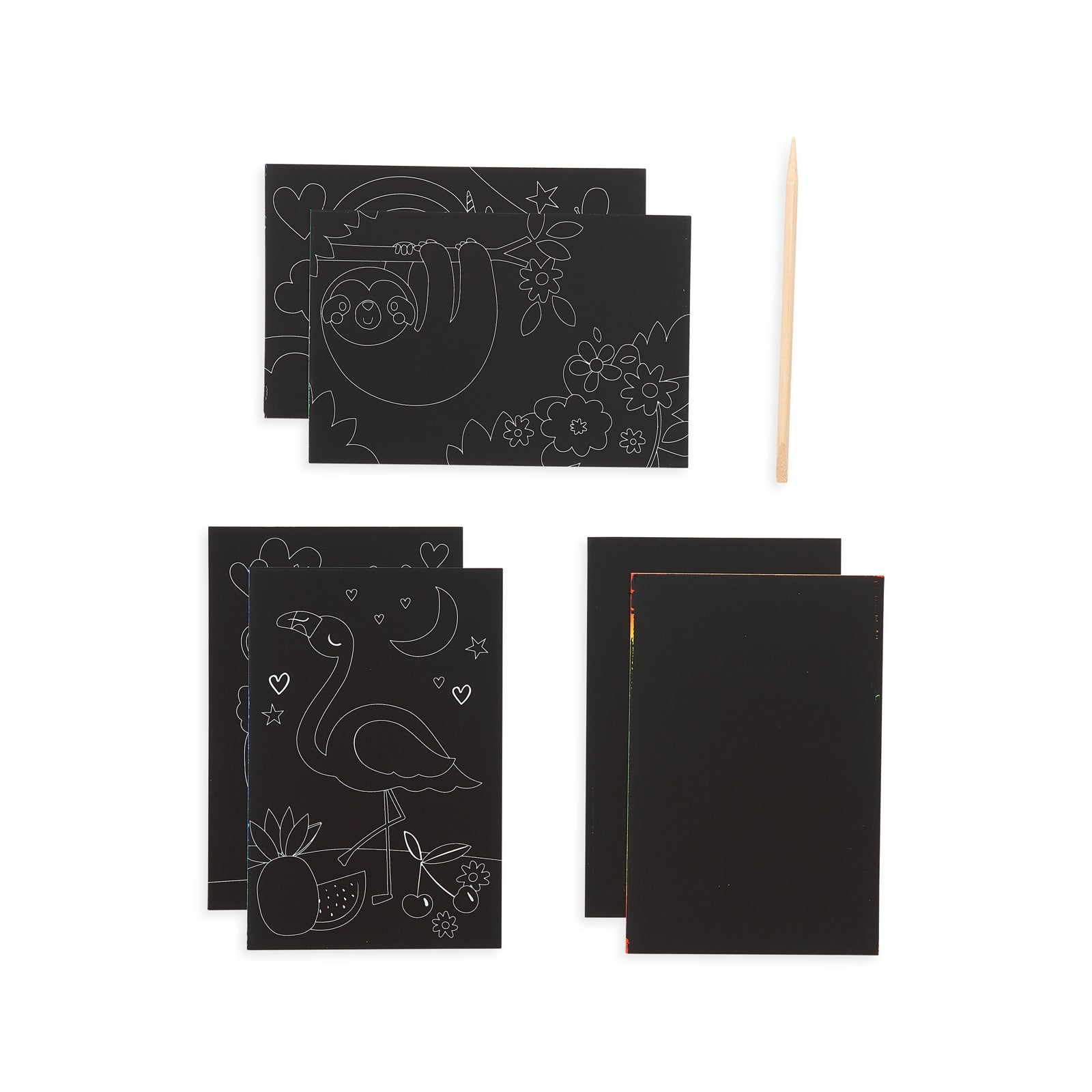 Inhoud: 4 geïllustreerde kraskaarten (4 x 6 inch). 2 regenboog DIY blanco kraskaarten. 1 houten pen – alles wat je nodig hebt om meteen aan de slag te gaan.