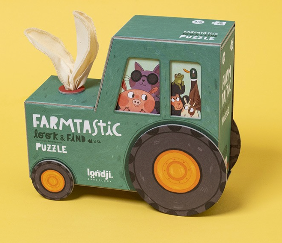 Een puzzel van 36 boerderijdieren in een doos in de vorm van een tractor, inclusief een observatiespel met 40 kaarten om te kijken, zoeken, fantaseren en plezier te hebben!