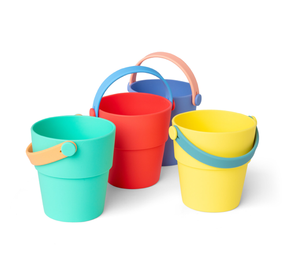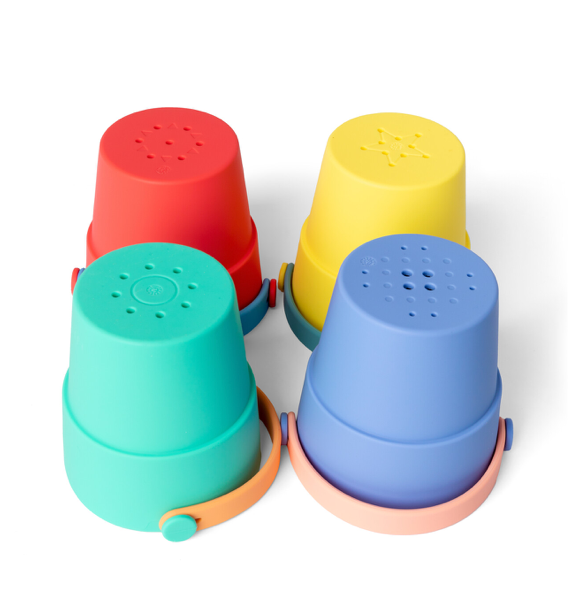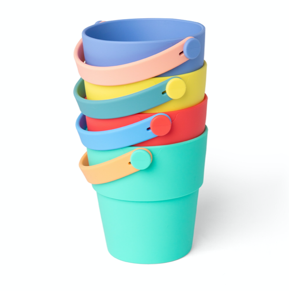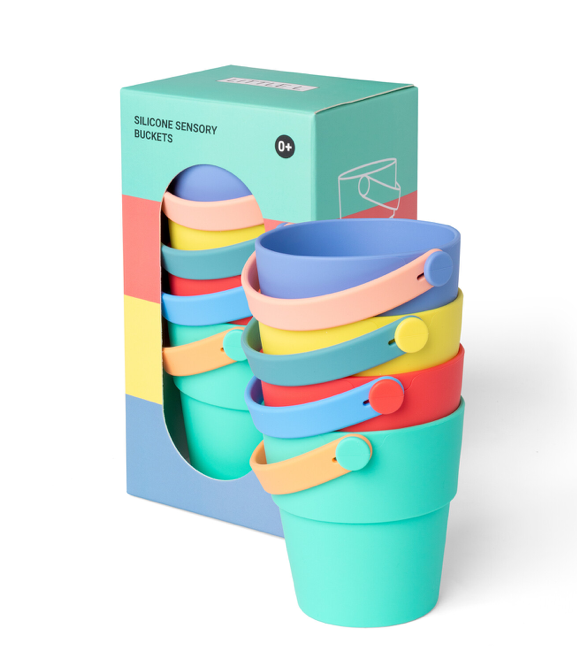 Deze schattige emmers zijn gemaakt van siliconen. Ze hebben een bodem met verschillende zeefjes in wat ze leuk maakt om te gebruiken met water en andere materialen zoals zand, speelparels, ... Hun klein formaat maakt ze handig voor sensorisch spel en kleine handen.
