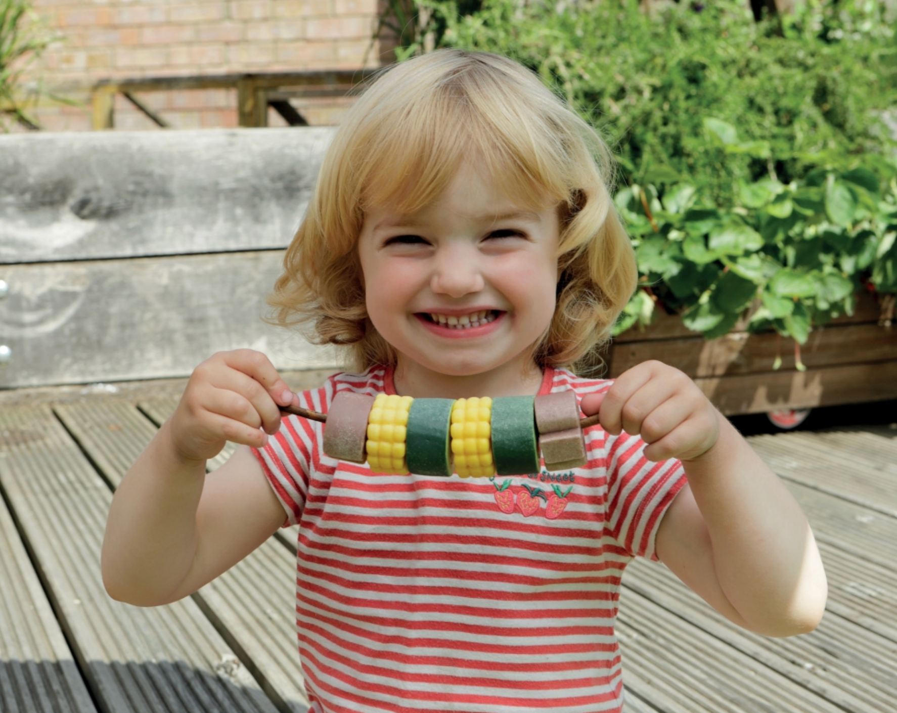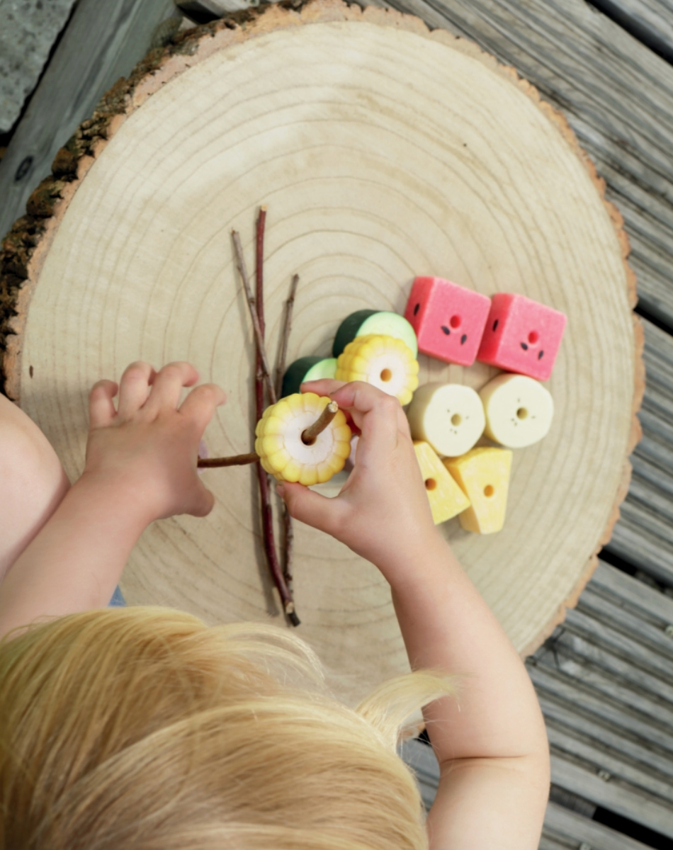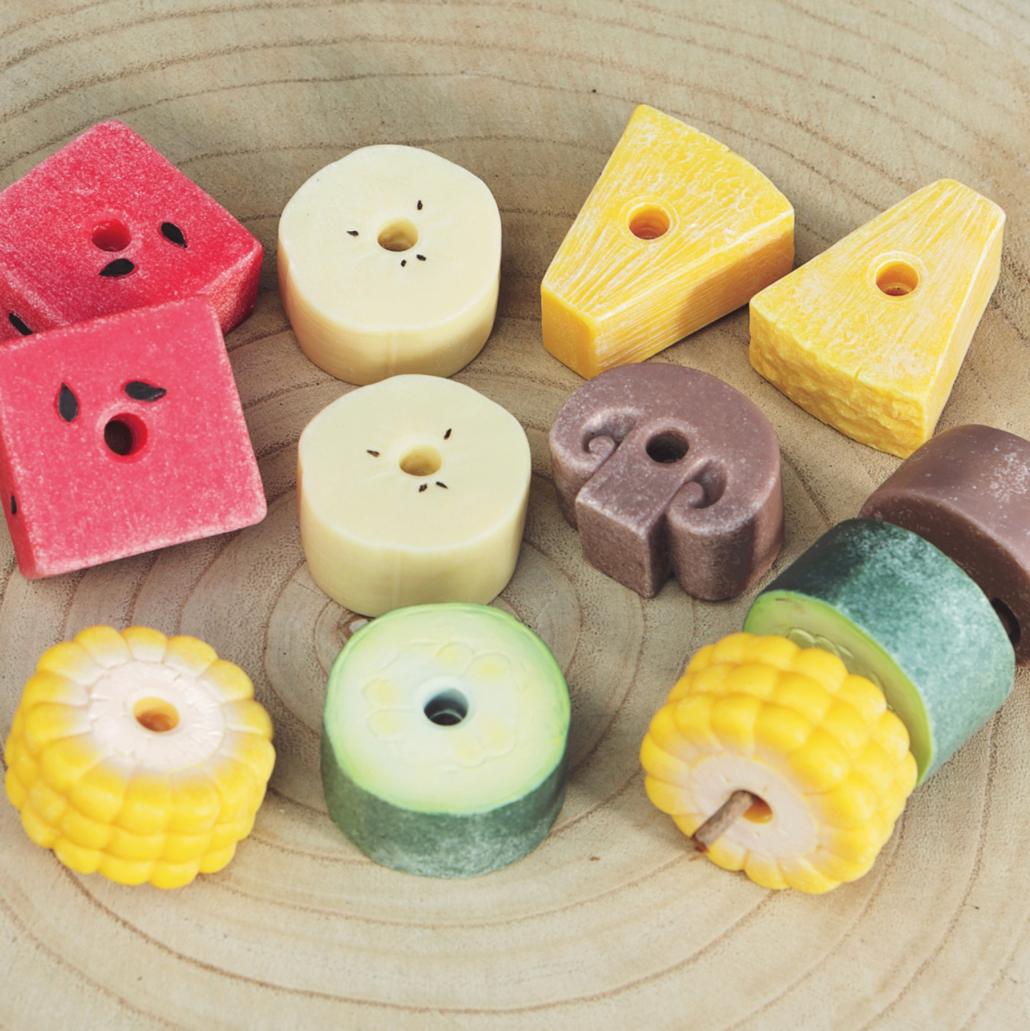 Maak heerlijke kebabs met deze intrigerende en realistische selectie fruit en groenten. Kinderen zullen het geweldig vinden om een stokje te zoeken en de gekozen steentjes eraan te rijgen, waarbij ze spelenderwijs kennismaken met voedsel, hun fijne motoriek ontwikkelen en patronen leren herkennen.