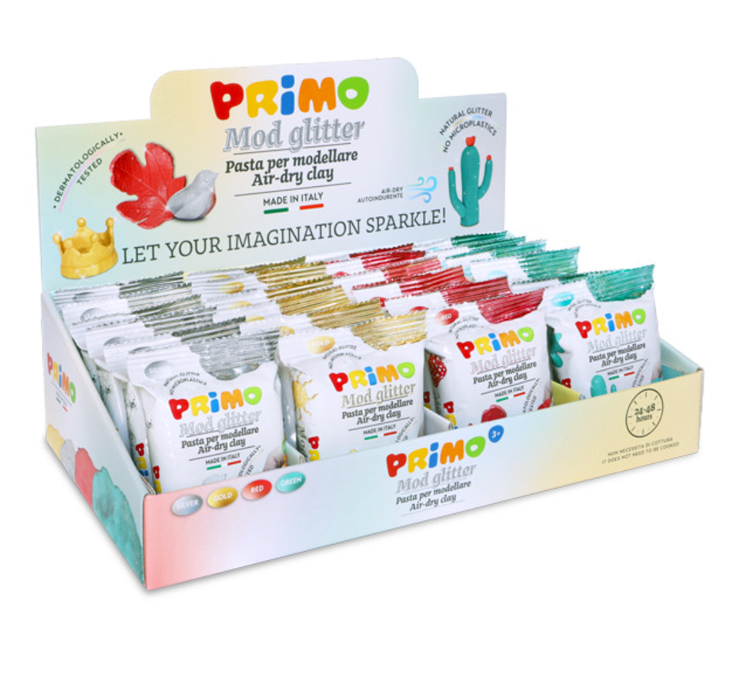 De MOD SPARKLING klei is een zelfhardende boetseerklei waarmee kinderen en volwassenen briljante en originele creaties kunnen maken zonder te bakken. De klei is gemakkelijk te modelleren met de hand of met boetseergereedschap, plakt niet en kan met een beetje water worden gladgestreken voor een nette afwerking. De pasta droogt in 24 tot 48 uur aan de lucht, waardoor hij gemakkelijk te gebruiken is in de klas, werkplaats of thuis.